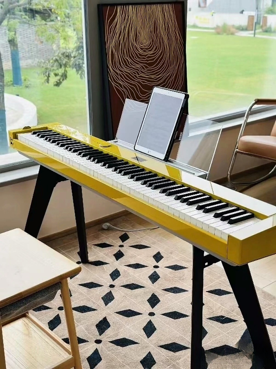 智慧型混合鎚動鍵盤(88鍵,雲杉木/樹脂混合,象牙/烏木質感)具5級觸控靈敏度與配重系統,模擬三角鋼琴觸感,靜音且反應靈敏。機身134.0cm x 24.2cm x 10.2cm,重14.8公斤(不含支架),支援8顆AA電池(約4小時)。配固定三踏板(阻尼器連續變量、輕音、延音)與木質支架,具鍵蓋與透明樂譜架。提供和諧芥末色、黑、白三色,現代設計融入家居。四揚聲器(8W x 4,電池時3W x 4)具空間音響與鋼琴位置調節功能(牆邊、桌面等)。
