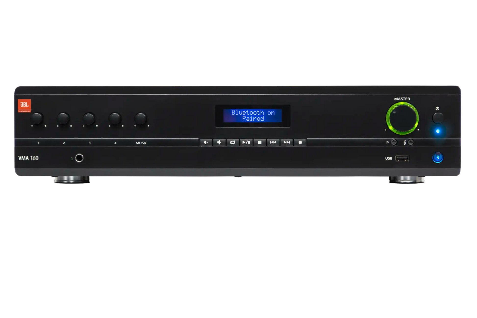 使用JBL VMA系列商用混音器放大器獲得傳奇音質,配備多輸入、低阻抗和高阻抗輸出、優先靜音和牆控兼容。