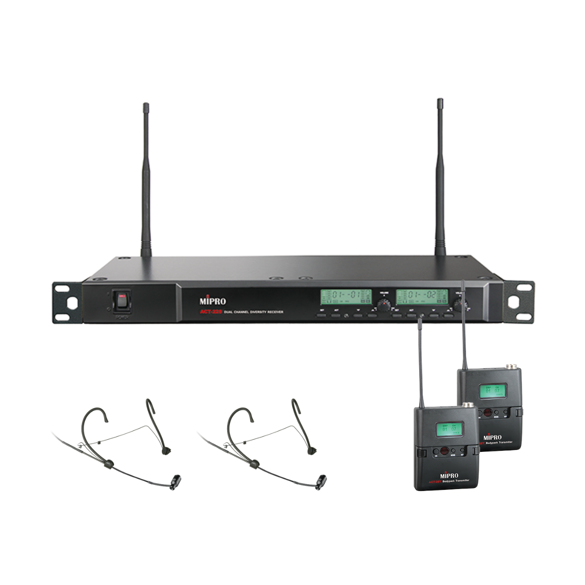 使用Mipro ACT系列無線系統獲得優質音質,配備雙頻道接收器、身背發射器和領夾麥克風。