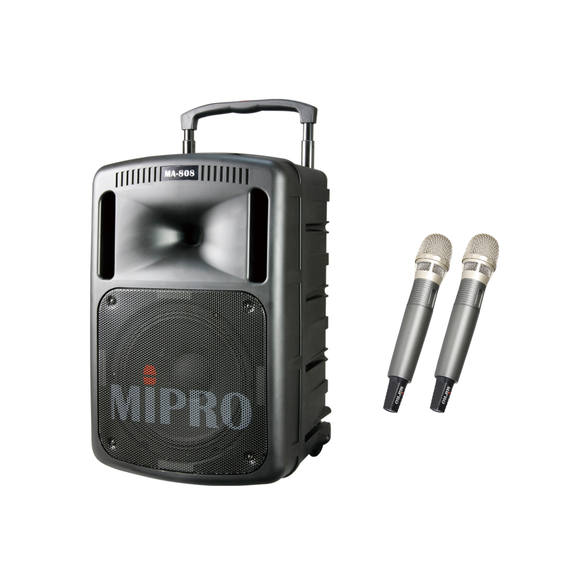 MA-808是優質便攜無線PA系統。267W最大功率,190W RMS,Class-D放大器。10英寸低音+1.5英寸高音揚聲器。內置雙頻道接收器,藍牙、線路輸入/輸出、擴展揚聲器輸出、警報器。