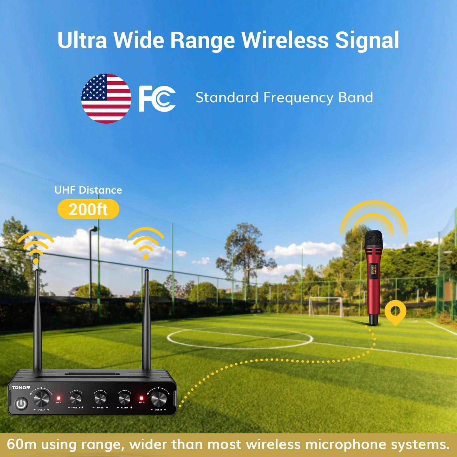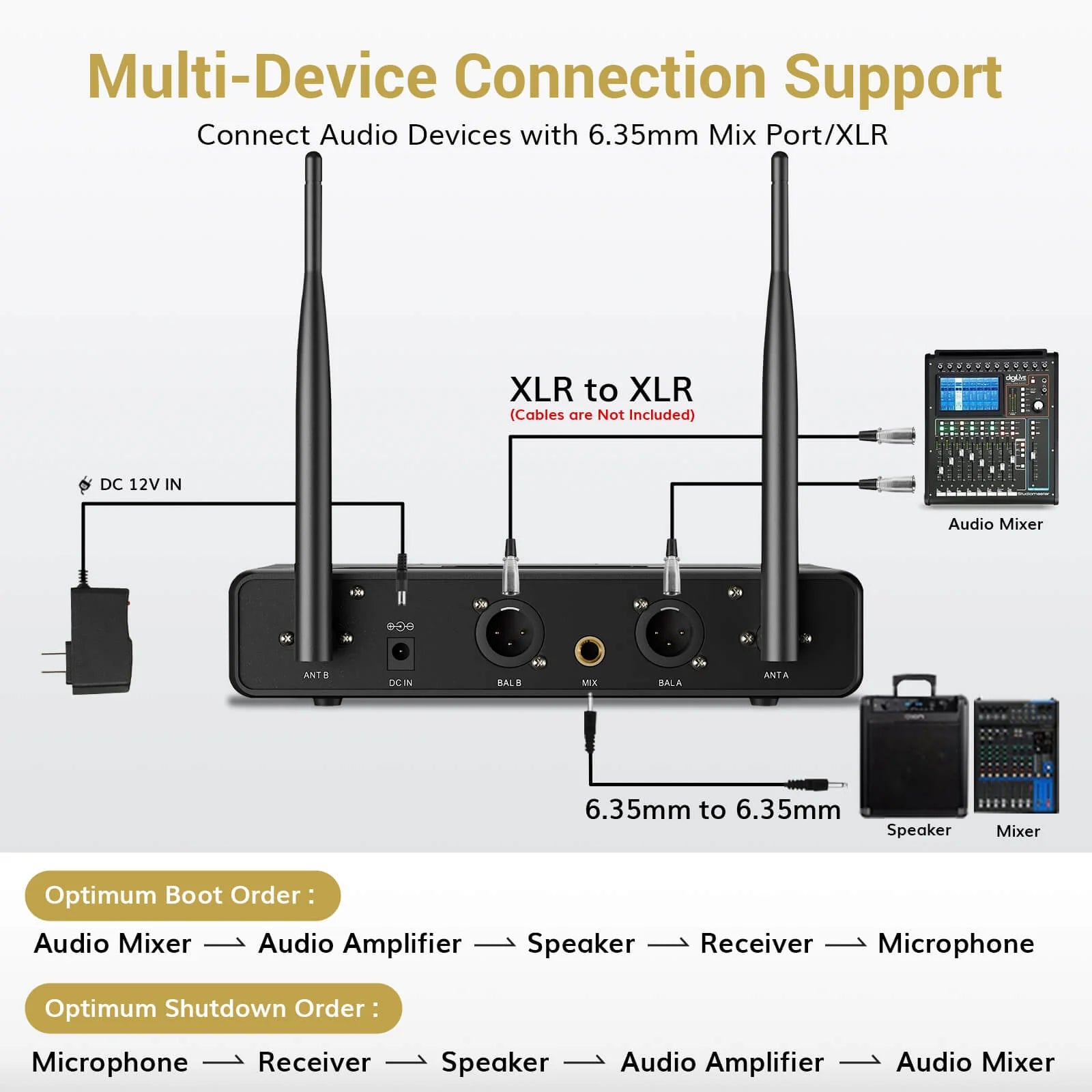 - 無線自由範圍: 我們的接收器提供200英尺的操作範圍,允許自由移動。非常適合室內/室外活動,如卡拉OK、婚禮和會議。